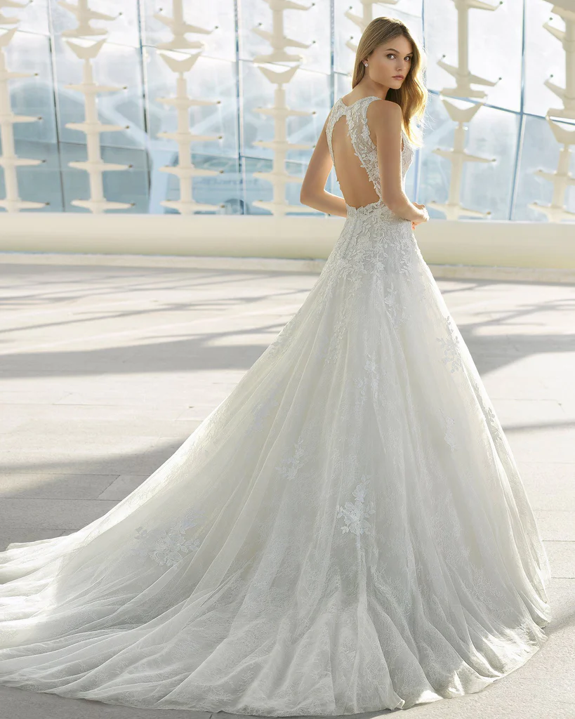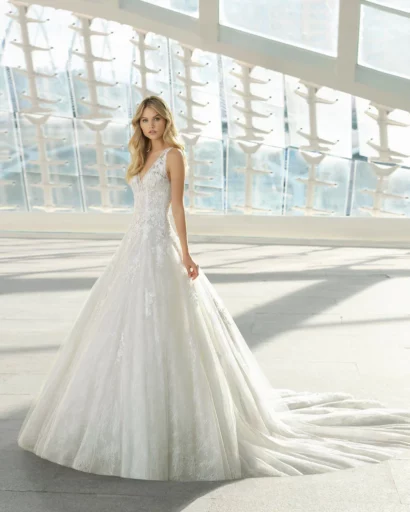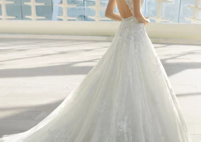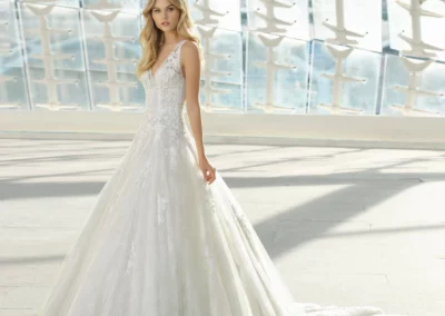 Diesen Brautkleid in A-Linie ist in der Farbe Ivory gefertigt. Das Oberteil hat einen schönen mit Perlen besetzten V-Ausschnitt und hat einen schönen Rückenausschnitt. Das Kleid ist aus zwei Lagen Spitzenstoff und diversen Tülllagen gefertigt und hat eine sehr schöne, ausladende Schleppe